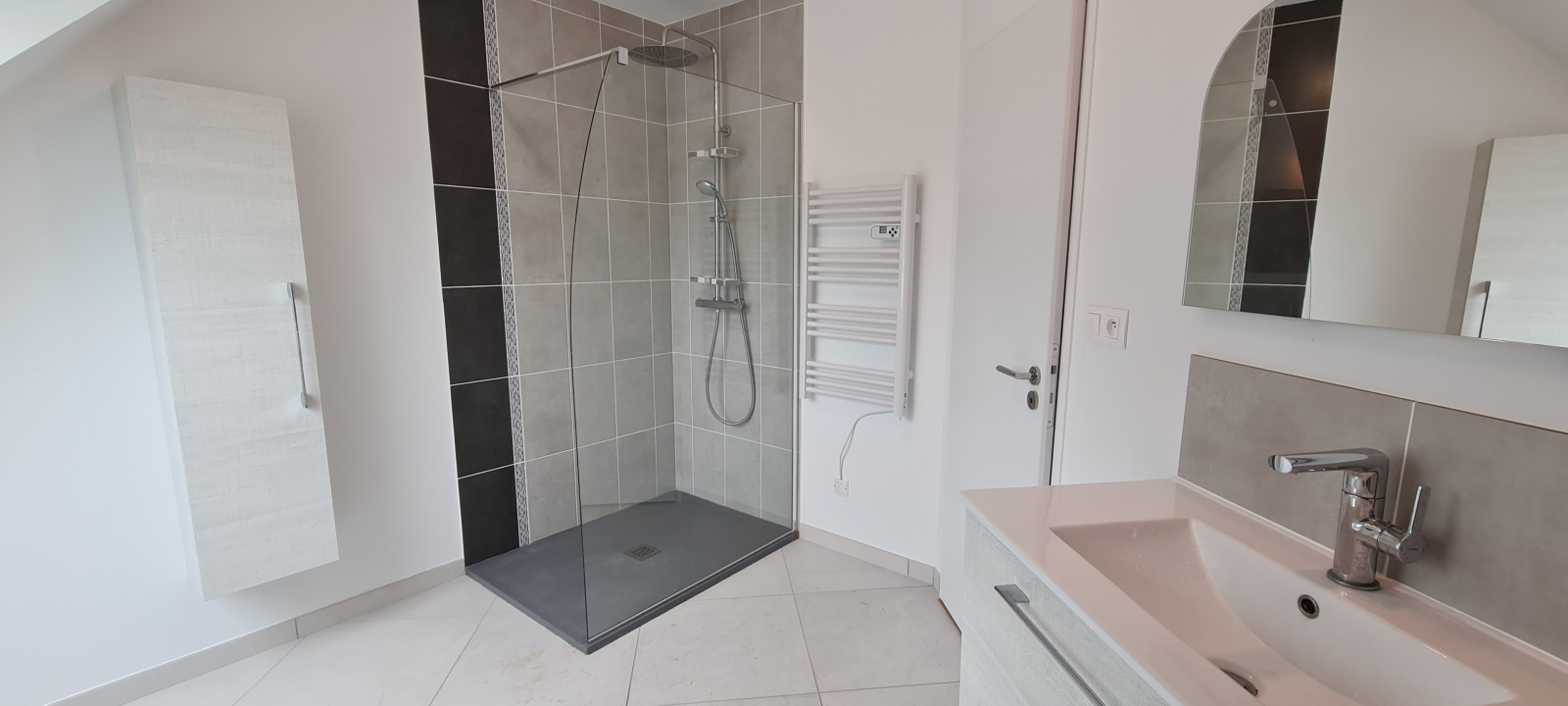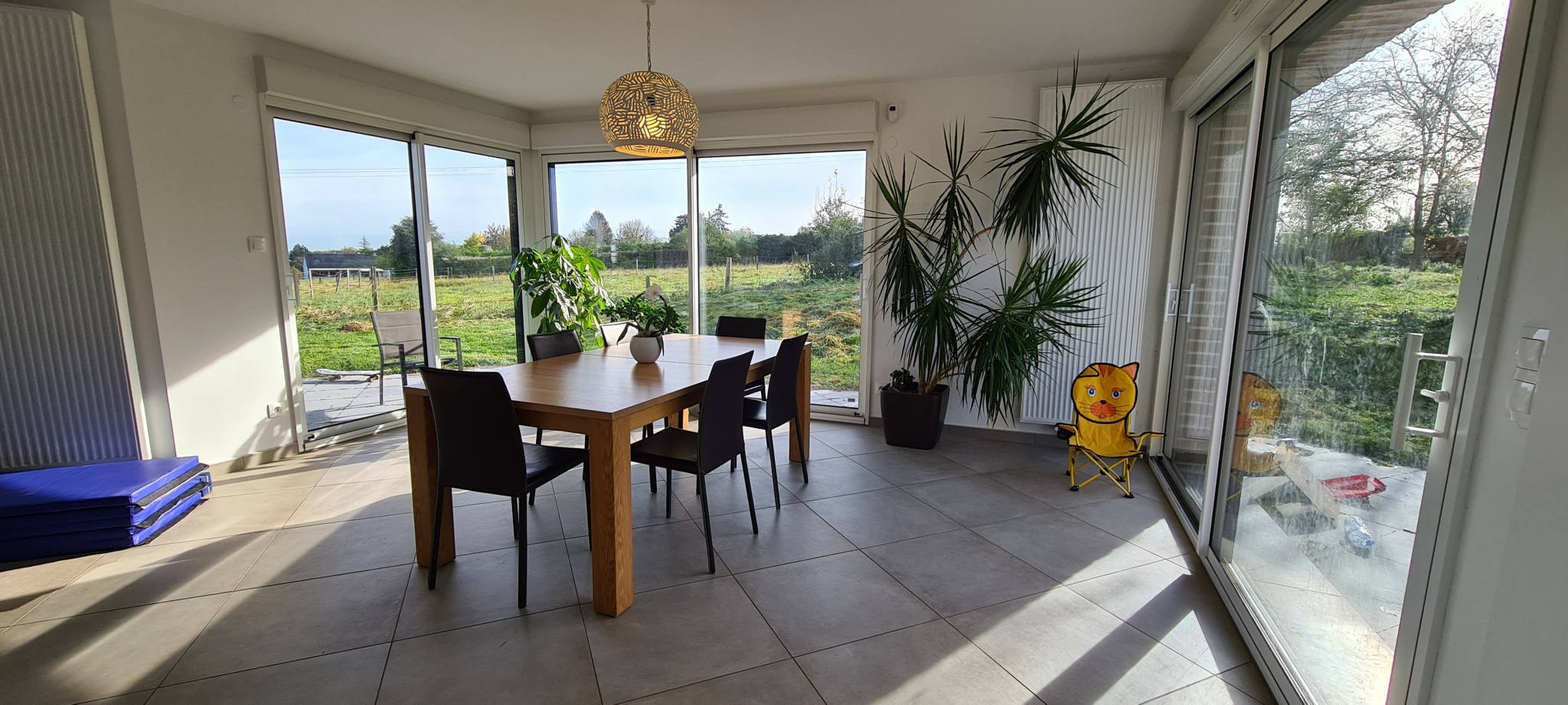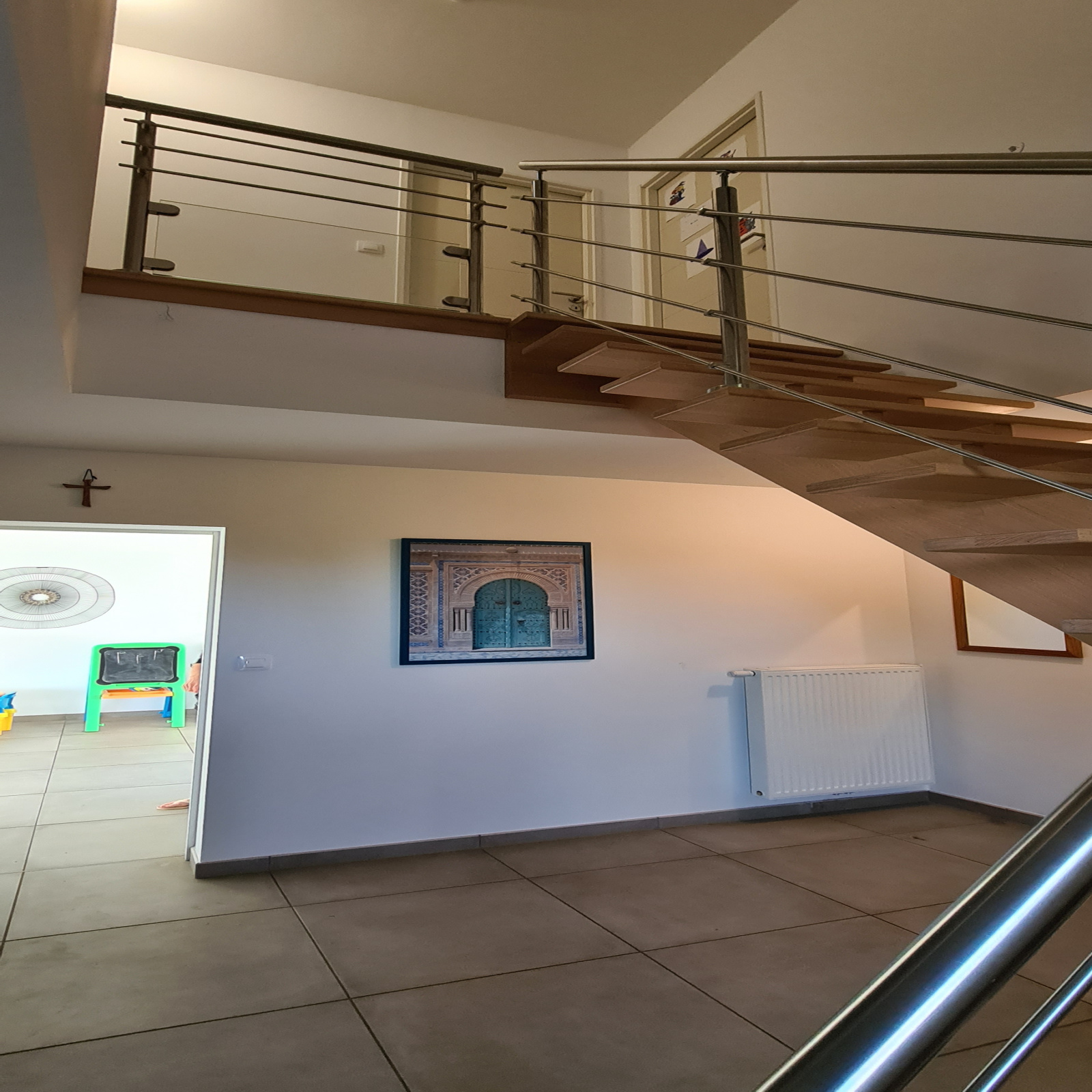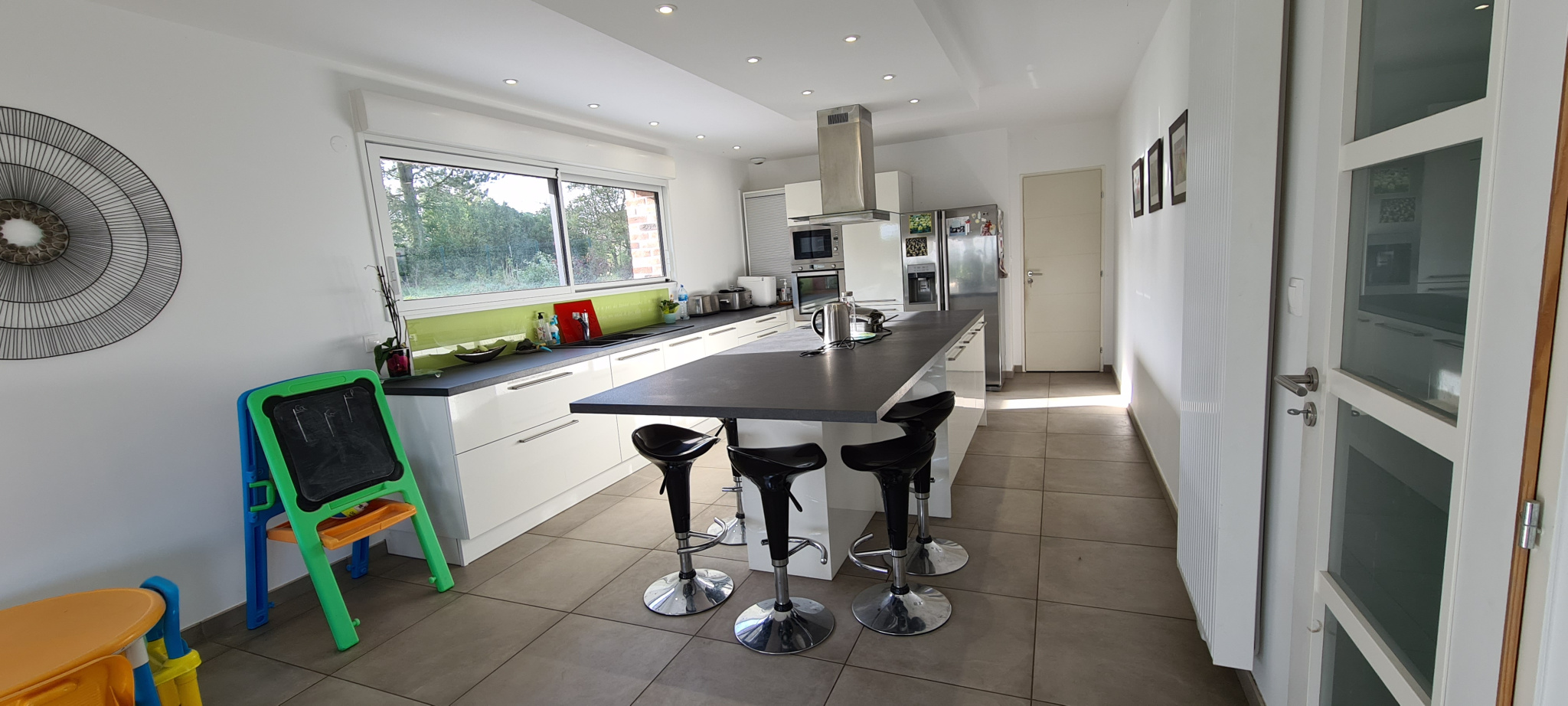 Le rez-de-chaussée s'articule autour d'un vaste espace de vie ouvert combinant salon, séjour et cuisine, baigné de lumière grâce à de grandes baies vitrées donnant sur les terrasses. Ce niveau accueille également une première chambre avec sa salle de bains attenante, un cellier pratique, un hall d'entrée généreux et des WC séparés. L'étage offre trois chambres confortables et un bureau, idéal pour le télétravail, desservis par un palier spacieux. Une seconde salle de bains et des WC indépendants complètent cet étage. La maison dispose également d'un garage attenant.