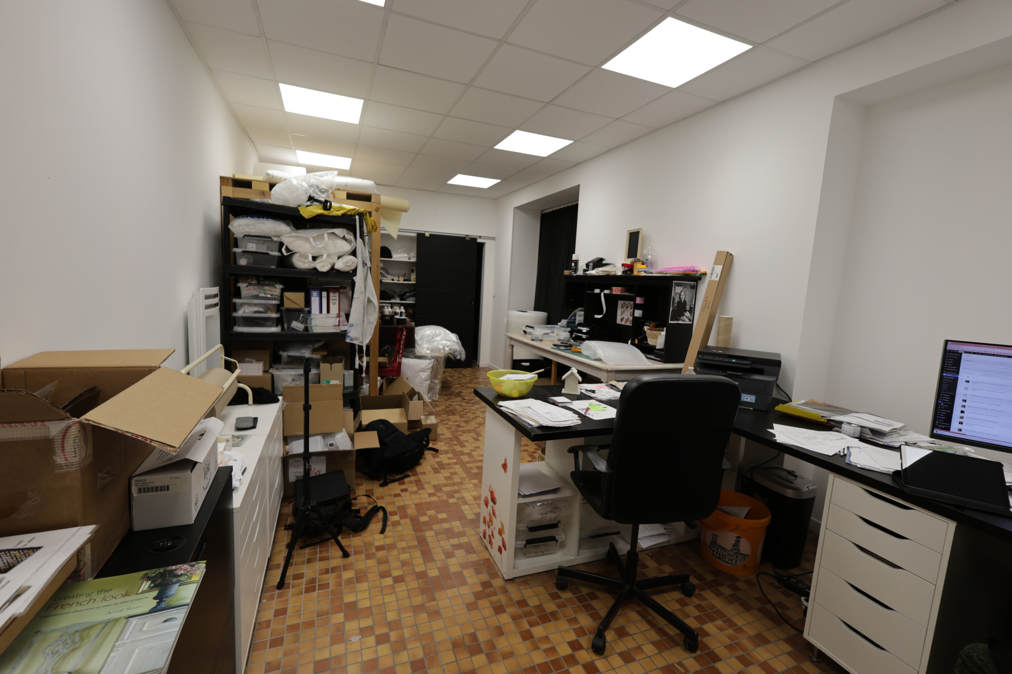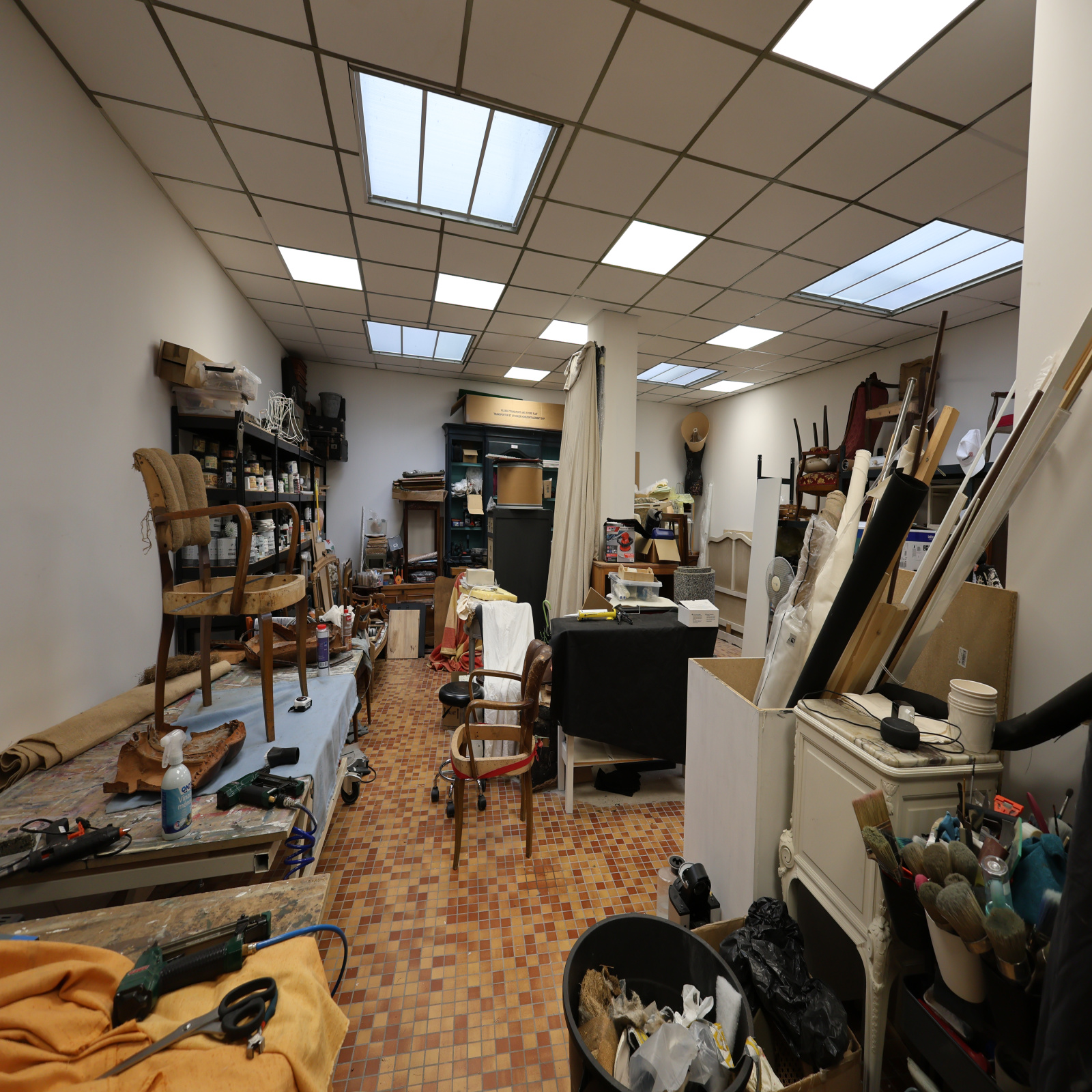 Rez-de-chaussée – Local commercial (~150 m²) entièrement rénové Espace commercial de 57 m² avec vitrine et accès vitré, bureau de 20 m², atelier de 70 m², WC et accès cave.